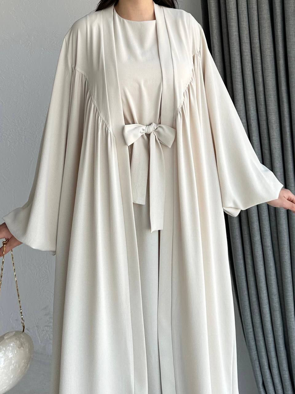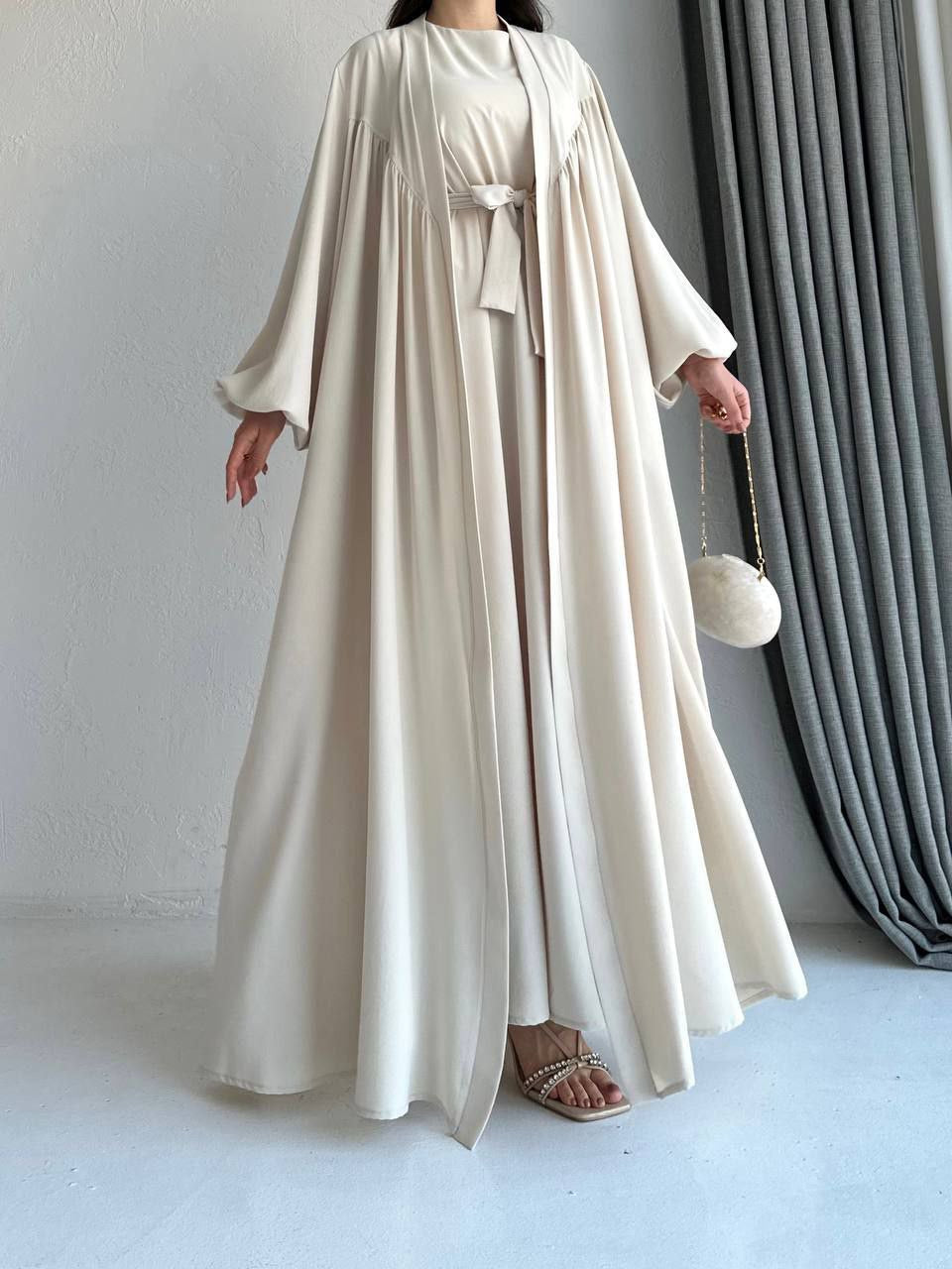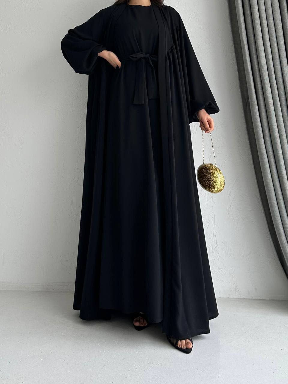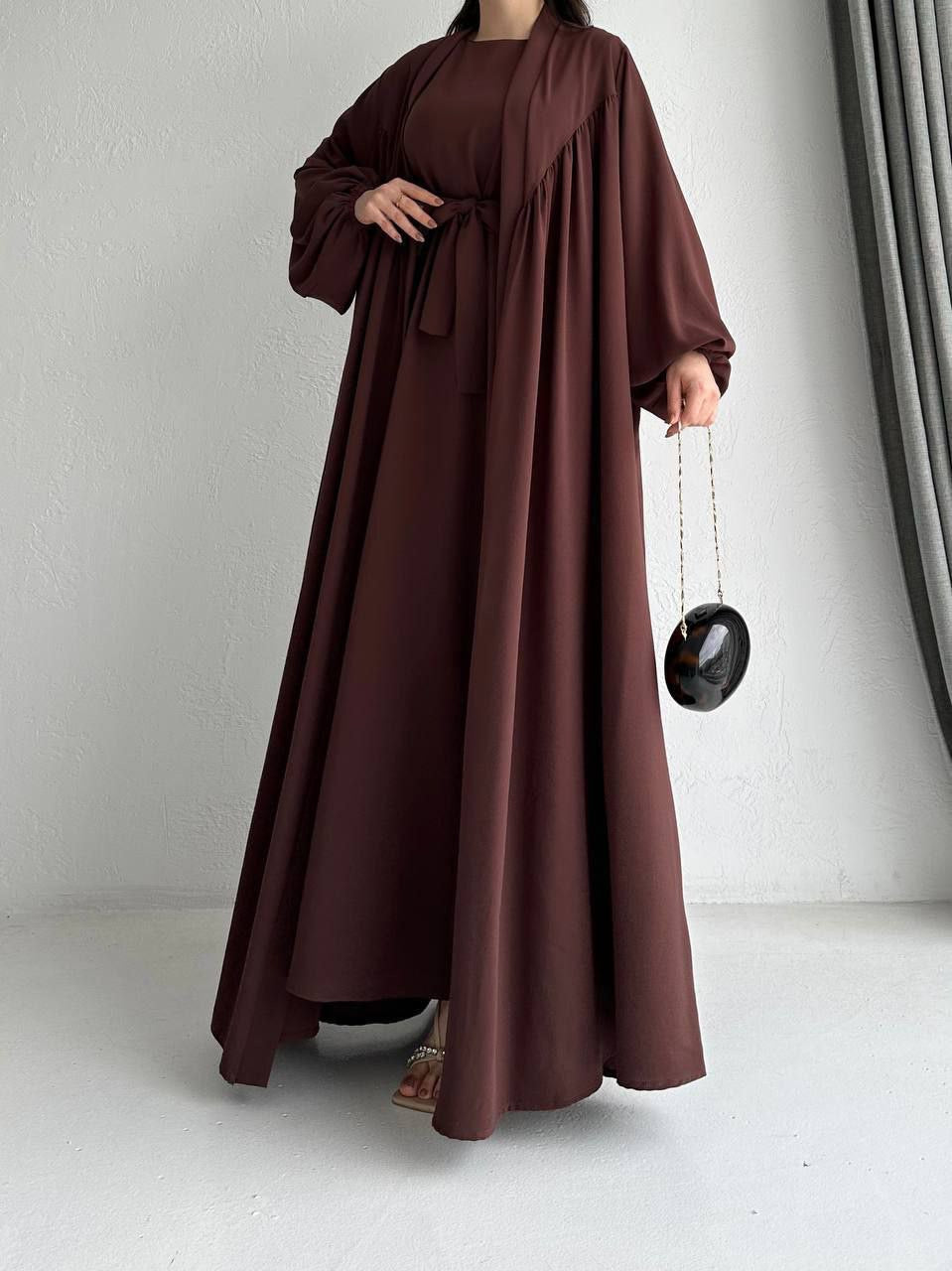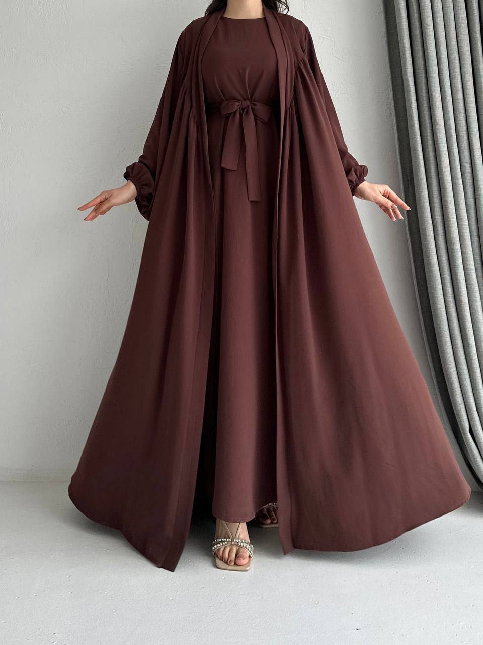 This elegant Abaya set, comes with a sleeveless inner dress, an open abaya and a belt. Available in brown, beige, and black