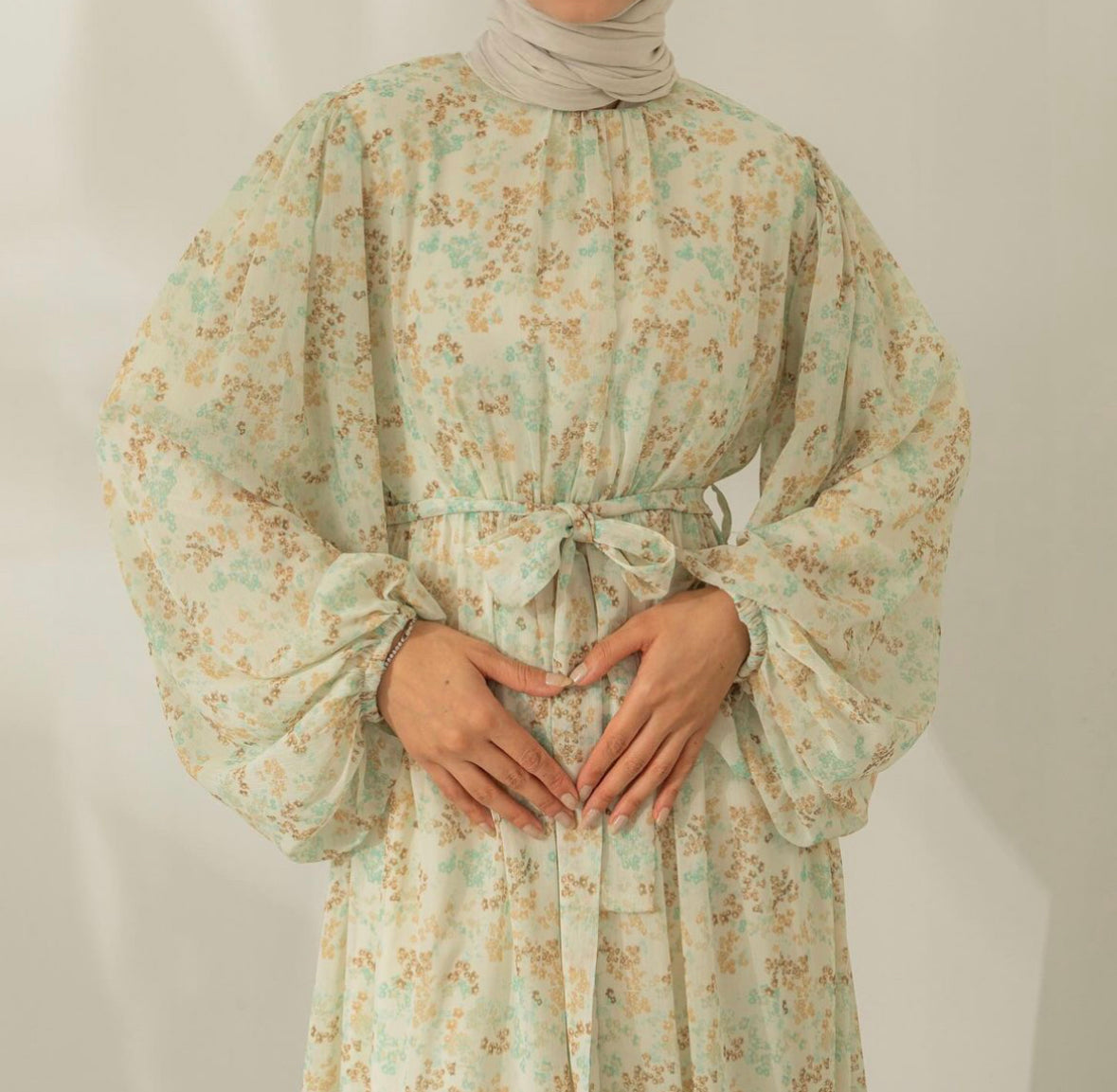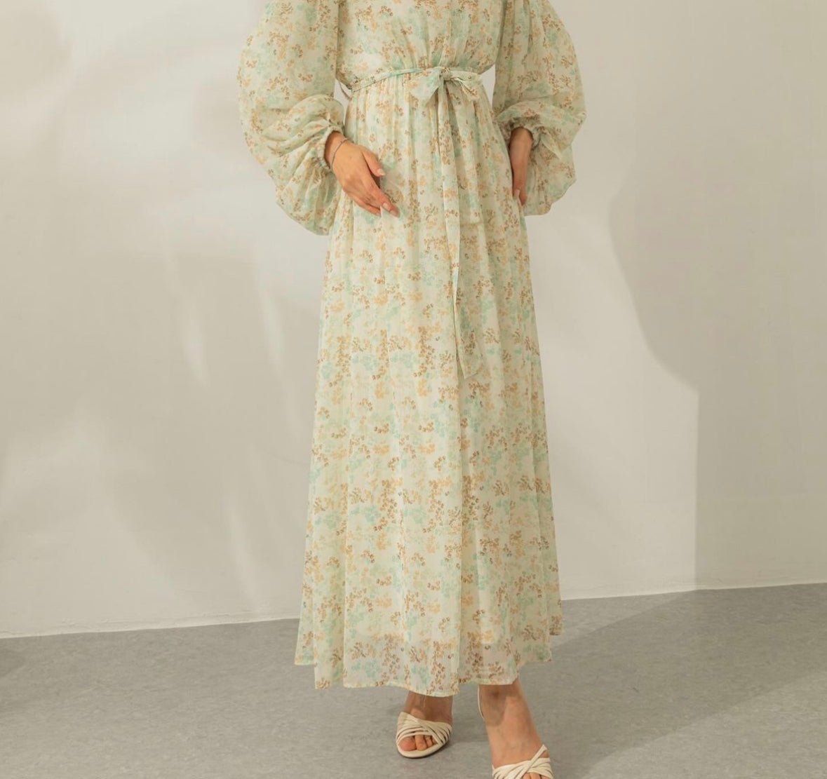 Flowy Chiffon Dress, adorned with beautiful flowers. Made with a non-see-through design - it features a lining underneath. This dress is true to size.
