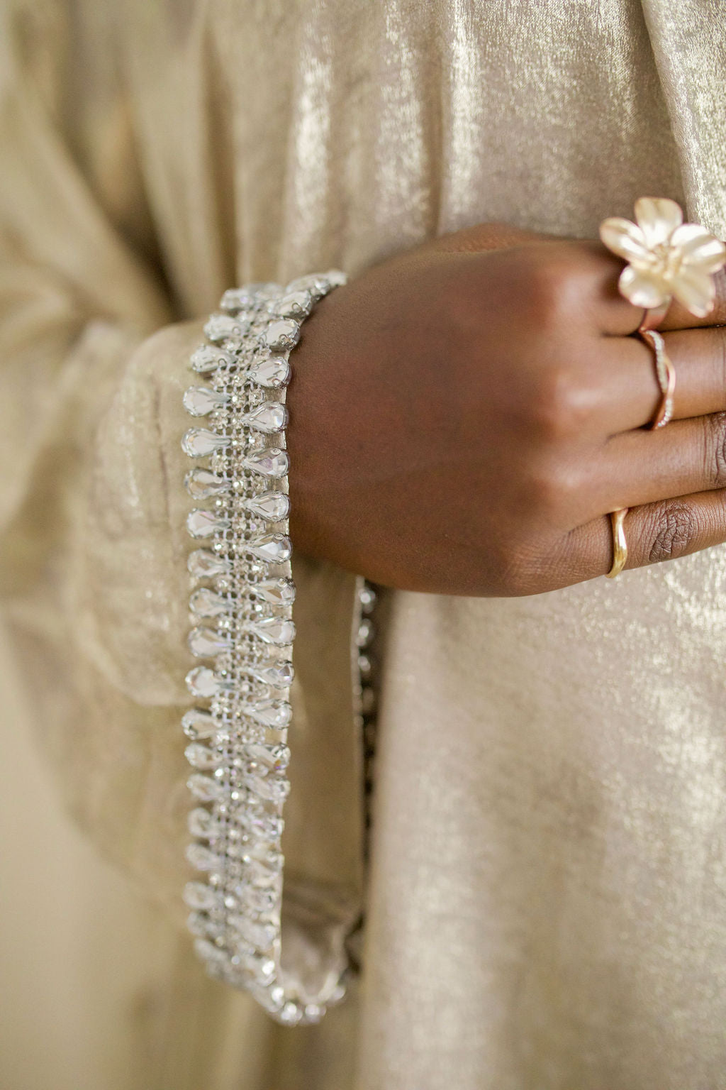 This set has a rich, luxurious look with its shimmering fabric and pearl-trimmed cuffs, making it perfect for special occasions. The set includes a matching hijab for a coordinated finish. Perfect for Eid, weddings, and formal gatherings.
