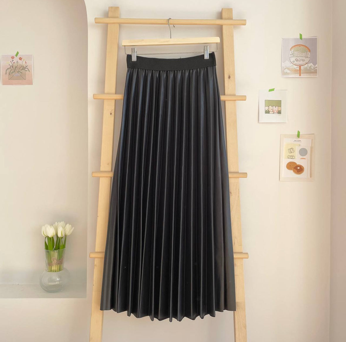 This pleated skirt has an elastic band, a shiny finish, and is non-see-through. It has a length of 90 cm.