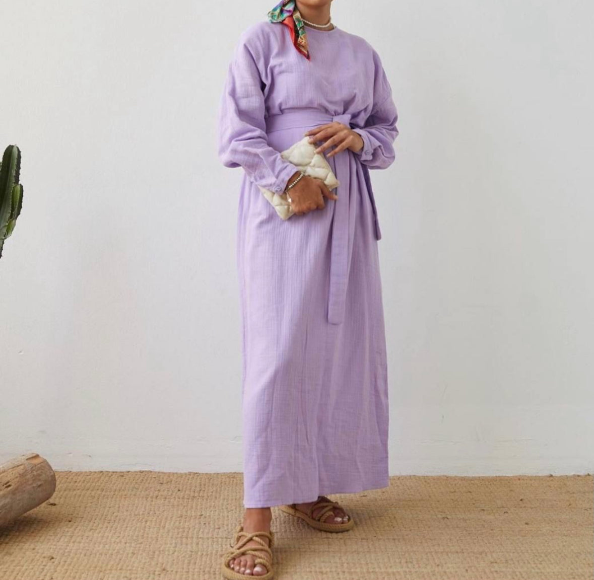 This long muslin dress offers a relaxed, modest fit that provides both comfort and style. The lightweight muslin fabric is breathable and perfect for warmer weather. It comes with a matching belt to define the waist for those who prefer a more tailored look, or it can be worn loose for a more relaxed fit.